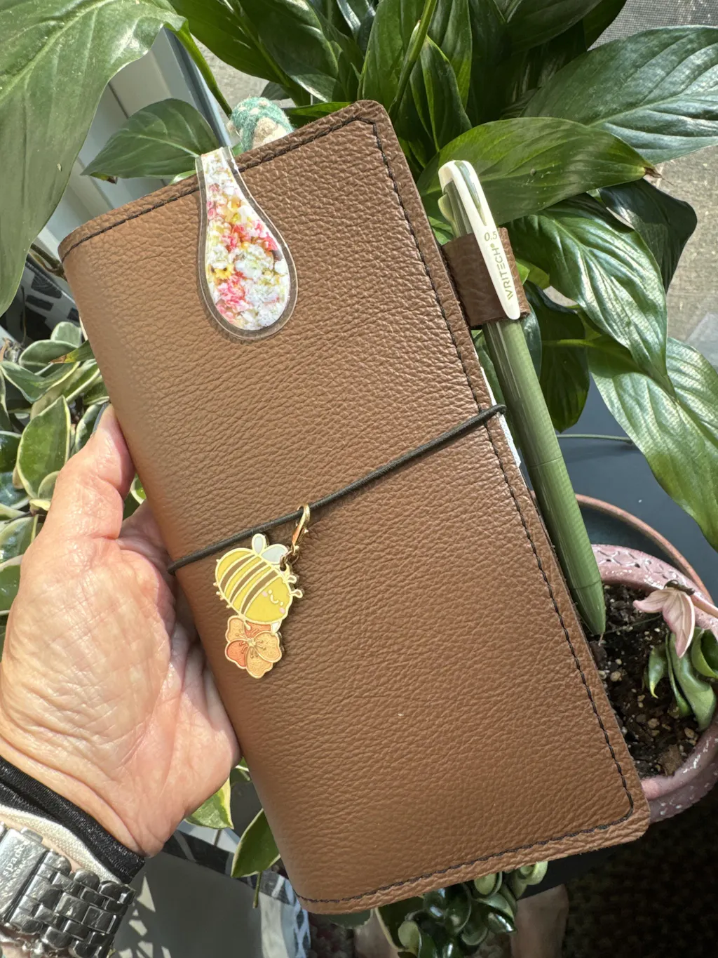 Our pen loops are constructed with elastic and matching leather. The addition of elastic allows the loop to stretch to make it easier to insert pens (especially larger ones).